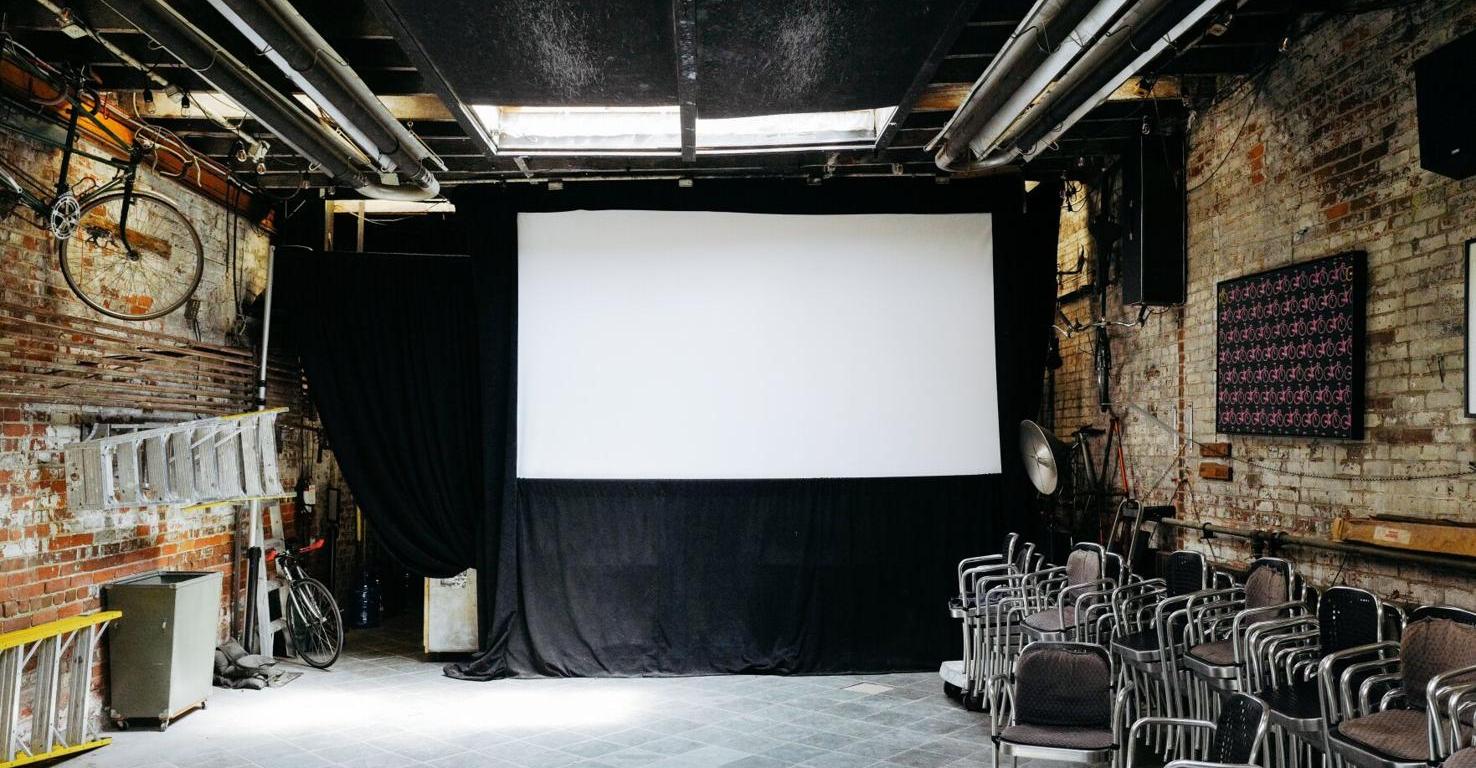 Inside the Victorian-era coach house behind 401 Richmond, exposed brick walls are lined with film paraphernalia, old projectors and a mess of vintage bicycle frames and wheels. Overhead, pipes and cables criss-cross the ceiling, adding to the space’s rough-hewn, mechanical charm. Stacked chairs for up to 70 attendees flank a large screen, while movie and cycling posters, and relics of past programs, lend the room a sense of layered history — part garage, part underground cinema, wholly unique in Toronto’s movie-going landscape.